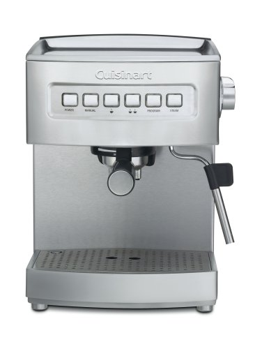 Brew a single or double espresso using either ground espresso or pods with this programmable espresso maker. The unit's 15 bars of pressure deliver consistently authentic espresso with excellent crema, while its stainless-steel steam nozzle makes it easy to turn an espresso drink into a frothy cappuccino or latte. Pre-programmed cup sizes include 1-1/2 ounces and 3 ounces. The espresso maker's 64-ounce reservoir removes for easy filling, and its steam button functions separately for convenience. Other highlights include a cup-warming tray on top, a removable drip tray and cover for easy cleanup, and a porta-filter holder with a locking mechanism, which makes it possible to quickly pump out wet grounds after each use. Accessories include a stainless frothing cup and a tamping tool with a measuring spoon. Beautifully designed in professional stainless-steel housing with an embossed Cuisinart logo, the espresso maker measures 10-1/2 by 9-1/4 by 12-3/4 inches and carries a three-year limited warranty.