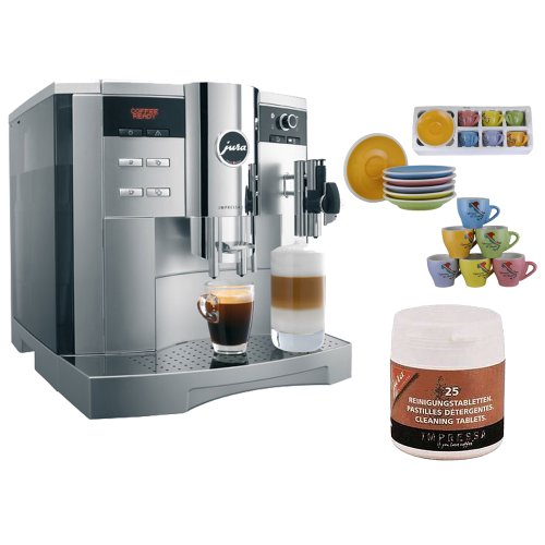 Jura Impressa S9 Refurbished One Touch 96oz Espresso Machine Platinum Metallic + Set Of 6 Espresso Cups & Saucers Tri Color + Accessory Kit