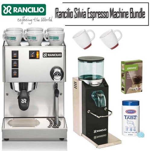 Rancilio is a company with a long tradition and our production of high-quality espresso machines dates back to the twenties. After decades of growth and learning, we proudly continue to offer products that are first in their class in design and technology. This Set Includes * Rancilio Silvia Espresso Machine * Rancilio Rocky Doserless Burr Grinder * Urnex Clearly Coffee 14OZ. Liquid Coffee Pot Cleaner * Urnex 3-pack 35G Grindz Coffee Grinder Cleaner * Two Bistro Wide Body Coffee Cup