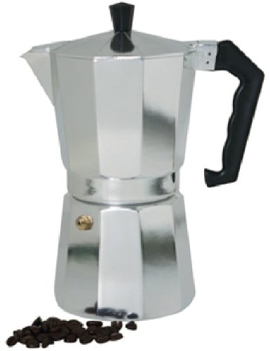 Espresso maker in polished aluminum quickly makes espresso on stove top, with a safety pressure release valve and heat resistant handle, serves nine cups.
