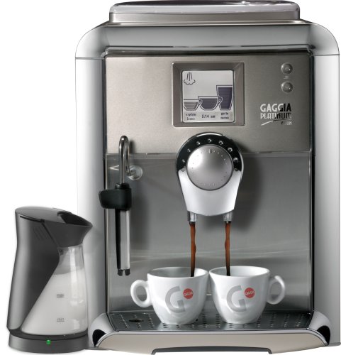 Gaggia’s 90950 Platinum-Vision automatic espresso machine has a wide assortment of features that set it above other machines. To make programming and adjustments simple and sophisticated, the it uses a digital touch screen to display icons and menu options. It also boasts many features seem on the Gaggia Titanium series, such as the E. Plus beverage strength system, temperature control, and a stainless steel front panel. Its stainless steel lined boiler assures rapid steam for easy brewing and steaming without the wait. The Gaggia Milk Island connects to the steam system to automatically froth and steam milk, and is available free via mail-in rebate. This classically designed machine features an active cup warmer, an electronic cup life, a bypass doser, a quiet and reliable ceramic burr grinder, the Aqua Prima water filtration system, and more. Use the menu to turn pre-infusion on or off, adjust coffee volume, program water hardness, perform rinsing and descaling cycles, and change the coffee dosage for each drink. Even the display itself can be customized to display words or icons, and the contrast can be increased for easier viewing. The Gaggia Platinum Vision speaks of great espresso, high end design, and luxury. |