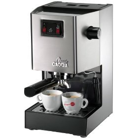 Product Features Coffee/espresso machine with 72-ounce removable water reservoir Stainless-steel housing; brass portafilters and grouphead for temperature stability 17-1/2-bar pump with high-voltage boiler; hot-water dispenser; frothing wand Single- and double-shot stainless-steel filter basket, tamper, and measuring scoop included Measures 14-1/4 by 8 by 9-1/2 inches Product Description Combining advanced technology with a classic design, this coffee/espresso machine for making hot drinks at home includes all the benefits of a commercial system. Designed in Italy by Gaggia, one of the most respected names in the espresso industry, the unit uses standard 58 mm filters to provide ample room for brewing rich, full espresso. Its commercial-grade construction includes stainless-steel housing, a high-power 17-1/2-bar pump with a high-voltage boiler for quick warm-up times, and an independent expansion valve. A three-way solenoid valve is also included, providing immediate pressure release from the grouphead once an espresso pull is completed, allowing the portafilter to be removed and the next shot to be prepared instantly. For excellent temperature stability, its portafilters and grouphead are made of heavy-duty marine-grade brass with chrome plating. The machine works with coffee pods and is designed to deliver two cups at once. Other convenient features include a hot-water dispenser for tea, a frothing wand for crema, and a cup warmer. A single- and double-shot stainless-steel filter basket, coffee tamper, and 7-gram measuring scoop are included. Its 72-ounce water reservoir is removable for easy filling or cleaning. To keep the espresso machine clean, simply wipe it down with a damp cloth. The unit measures 14-1/4 by 8 by 9-1/2 inches. --Catie Unger Product Description Consumers Best Buy! The Gaggia Classic is one of our best sellers for several reasons. Commercial grade quality: Rugged construction of heavy duty materials for longevity. High...